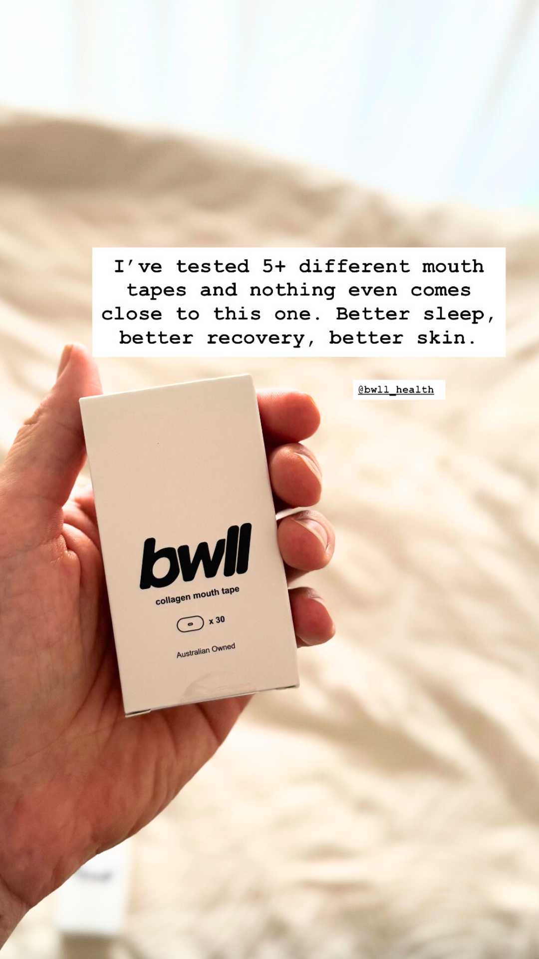 BWLL Collagen Mouth Tape is designed to help you sleep better by gently keeping your lips closed, encouraging nose breathing. It’s also infused with collagen to hydrate and nourish your lips overnight.